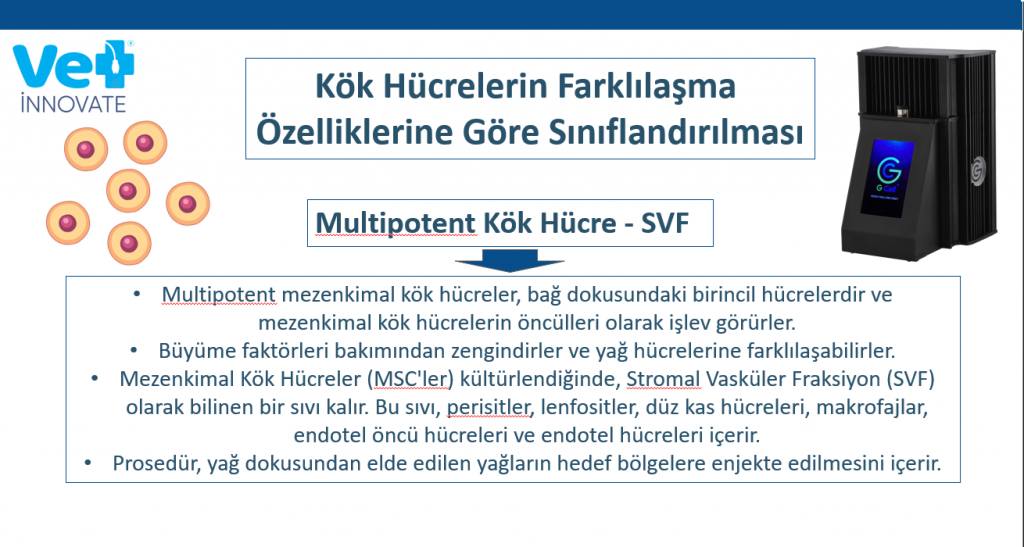 Hayvanın kendi yağ veya dokusundan alınan numune ile 40 dakika içerisinde, kaliteli ve zengin kök hücreler içeren SVF bazlı bir hücre kokteyli hazırlanır.
